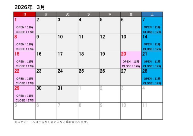 BMXパーク2026年3月のBMXパーク営業日は下記となります。