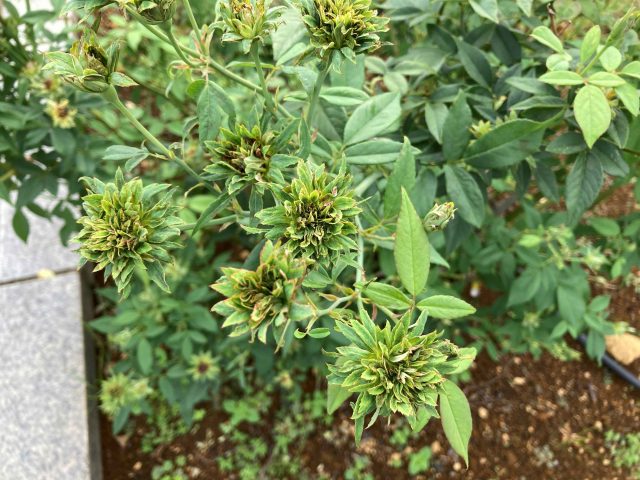 「ロサ キネンシス ビリディフローラ」という緑色の花が咲くバラが咲いています。