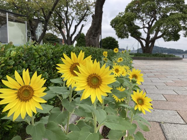 コルセールワーキングスペース前で、ひまわり「ジュニアスマイル」が元気に開花しています。背丈は控えめながら、澄んだレモンイエローの花びらが並んで咲き、灰緑色の葉とのコントラストが歩道を明るく彩ります。
