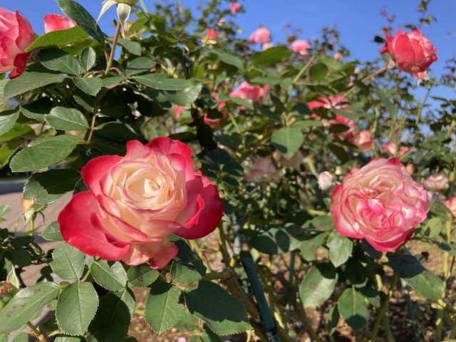 うみかぜの路(ウッドデッキ)沿いにある、ロイヤルローズ花壇でお楽しみいただける「ジュピレ デュ プリンス ドゥ モナコ」も美しく咲き進んでいます。アイボリーの中心から外縁に向かって鮮やかなルージュが差す、気品あるコントラストが特徴。花弁は重なりが豊かで、開花が進むほど輪郭がくっきりと映え、陽光を受けて宝石のように輝きます。香りはやさしく上品です。近くで眺めると色のグラデーションや花弁の質感まで堪能できます。晩秋の庭を華やかに彩る「ジュピレ デュ プリンス ドゥ モナコ」を、ぜひ園内でご覧ください。