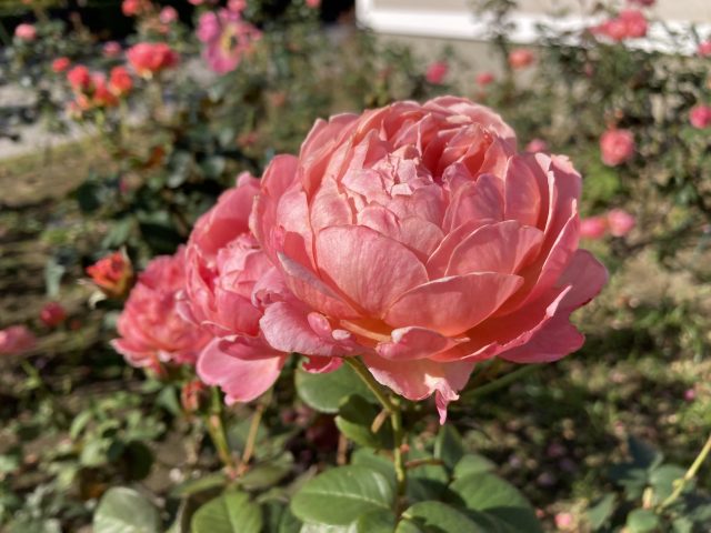 本日11月15日(土)、秋晴れの光を受けて「カオリカザリ」が見頃を迎えました。幾重にも重なる花びらは、サーモンピンクからコーラルへとやわらかく移ろい、開くほどに華やぎを増します。