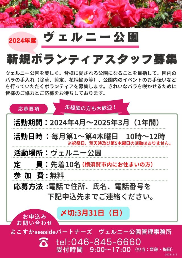 【応募方法】住所、氏名、電話番号をヴェルニー公園管理事務所(046-845-6660)までご連絡下さい。