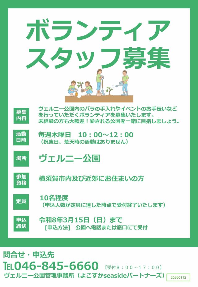 【応募方法】住所、氏名、電話番号をヴェルニー公園管理事務所(046-845-6660)までご連絡下さい。