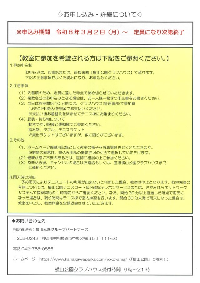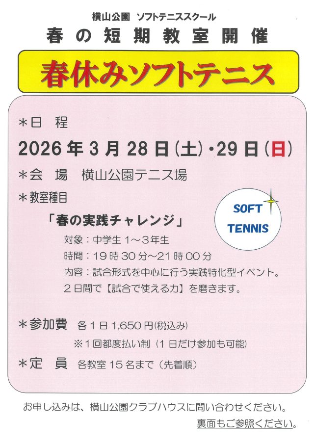 イベント情報 春休みソフトテニス短期教室開催 開催予定 特定日開催 有料 予約制 雨天中止 春休みソフトテニス短期教室を開催します。ふるってご参加ください。 詳細データ 開催期間 3月28日(土曜日)~3月29日(日曜日) 関連情報 チラシPDF 一覧へもどる