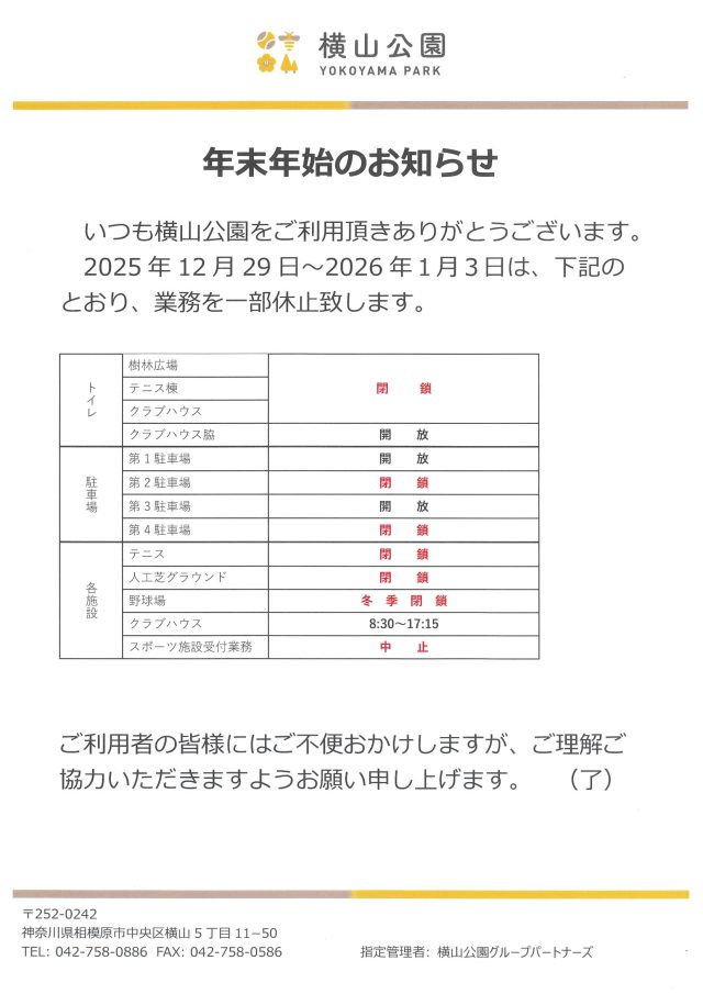 お知らせ 年末年始のお知らせ 配信日:2025年12月5日 年末年始のお知らせ いつも横山公園をご利用頂きありがとうございます。 2025年12月29日~2026年1月3日は、下記の通り業務を一部休止致します。 ご利用者の皆様にはご不便おかけしますが、ご理解ご協力頂きますようお願い申し上げます。 一覧へもどる