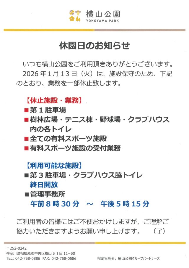 お知らせ 休園日のお知らせ 配信日:2025年12月28日 いつも横山公園をご利用頂きありがとうございます。2026年1月13日(火)は、施設保守のため、下記のとおり、業務を一部休止致します。 一覧へもどる